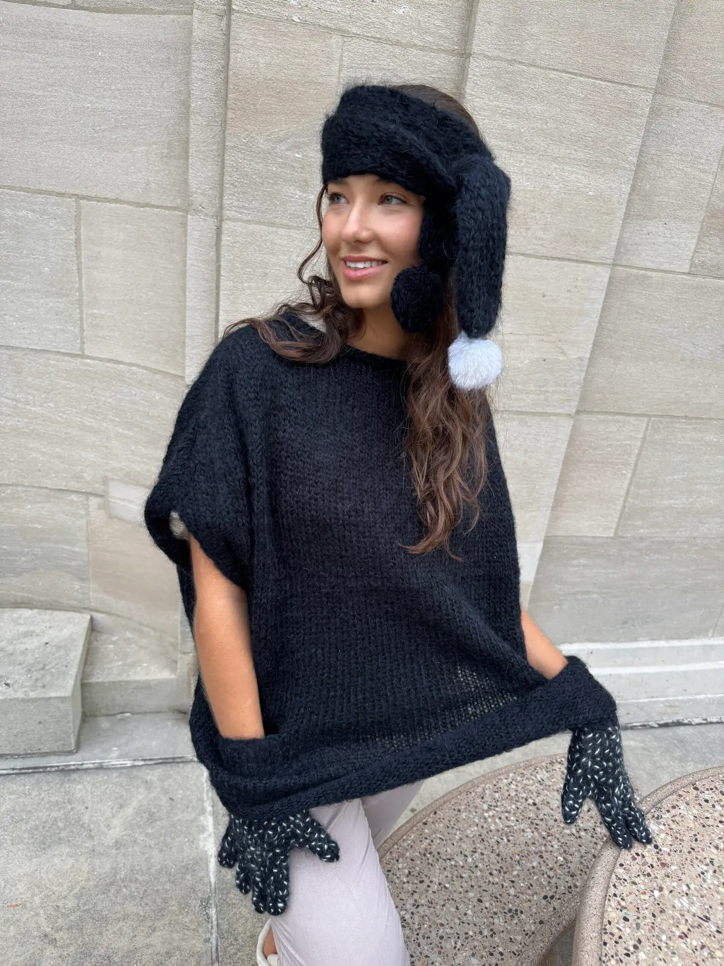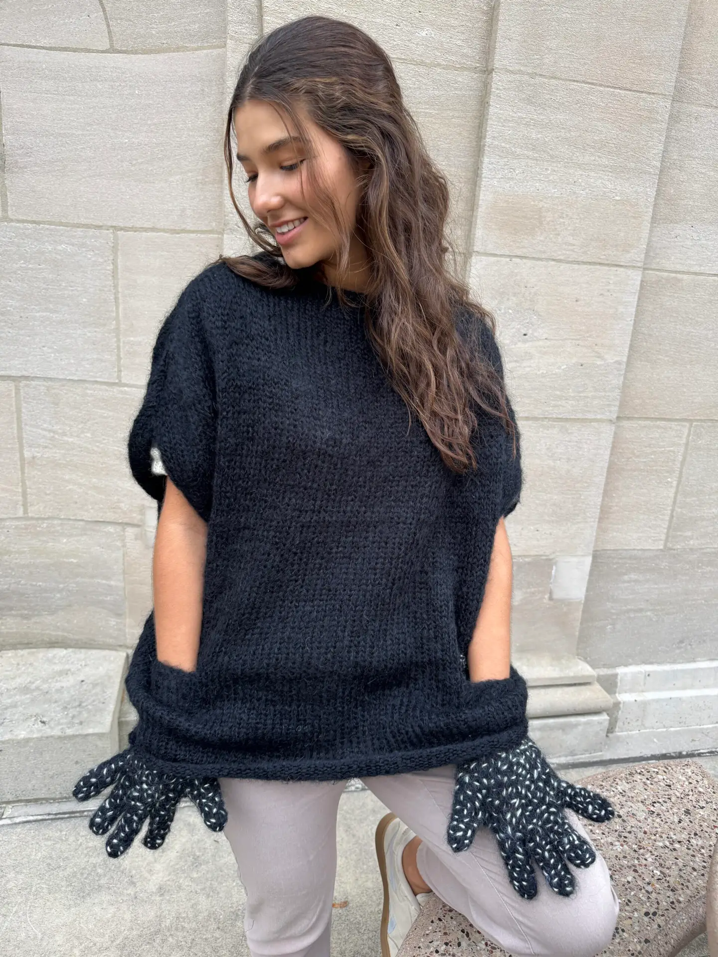 Crafted from soft, lightweight black mohair yarn, this piece features signature built-in glove pockets—a unique and functional detail that keeps your hands warm while adding a bold design element.